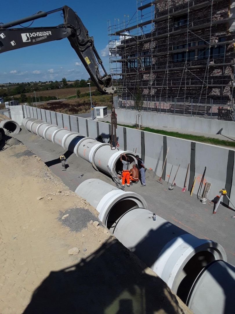 Der Fachplaner hatte ursprünglich in einer Grünfläche ein System aus einem anderen Werkstoff vorgesehen, welches nicht bei niedrigen Überdeckungen befahrbar ist, sowie auch nicht von innen begehbar gewesen wäre. Im Falle einer Verschmutzung oder einer Havarie auf dem Gelände des Betreibers wäre auch daher eine Inspektion bzw. Reinigung nur unter erheblichen Aufwand verbunden. Mit unseren Stahlbetonrohren in DN1400 und DN2000 sind die Kanäle direkt innen begehbar und somit nicht nur nachhaltig und stabil, sondern auch für eine Wartung erheblich vorteilhafter.