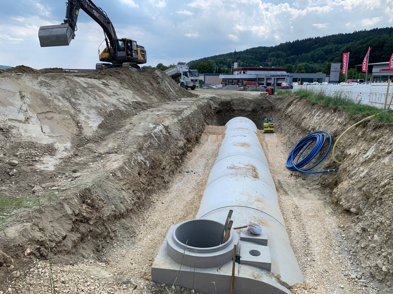 mit jeweils 200 m³ Volumen geplant. Röser GmbH lieferte eine Variante davon als Bauvariante mit DN2400 Stahlbetonrohren.